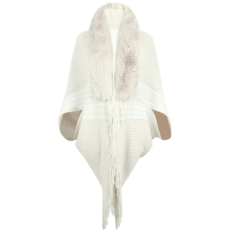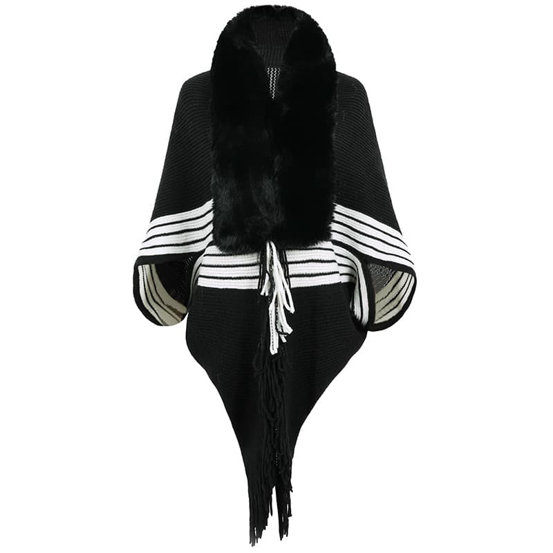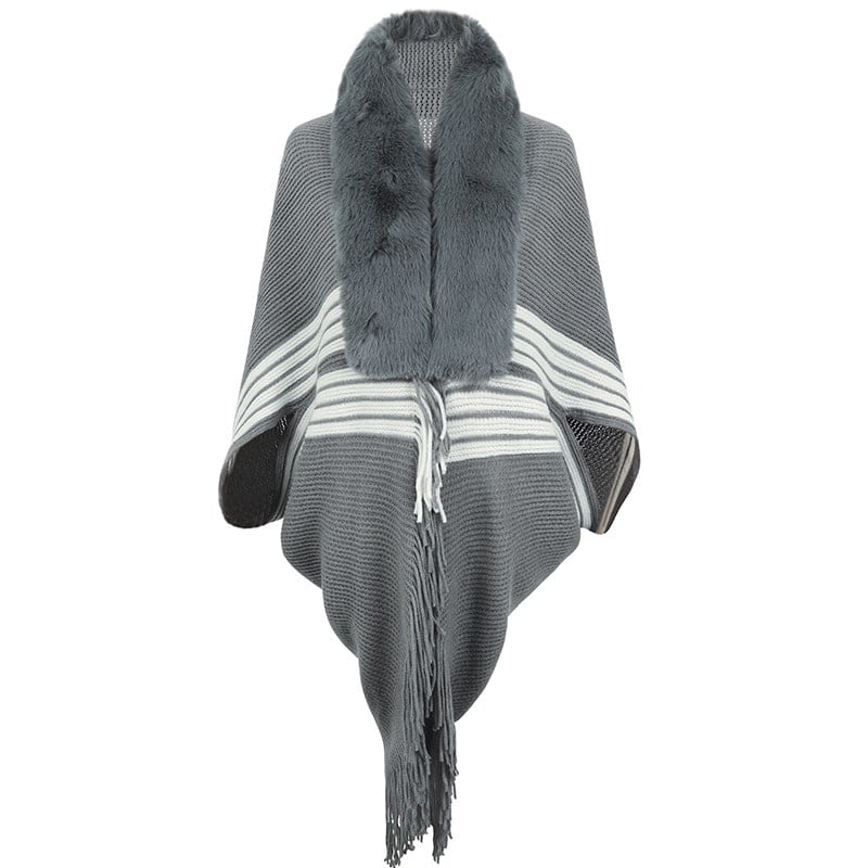 Embrace the chilly allure of autumn with our chic and cozy poncho. Adorned with a plush grey fur collar and an elegant fringe hem, this stylish beige and white striped shawl promises to keep you warm and fashionable through the season. Its soft, jersey knit texture gives off a luxurious feel reminiscent of a fine wool blend – a perfect sartorial choice for anyone looking to elevate their fall and winter wardrobe. Experience comfort and fashion in one elegant package with this must-have autumn-winter accessory. Style: Casual Fit: Regular Fabric: Jersey Pattern: Stripe Element: Fringe Top Length: Long Sleeve Type: Dolman Sleeve Sleeve Length: Long Sleeve Closure Type: Others Main Composition: Polyester Season: Fall/Winter
