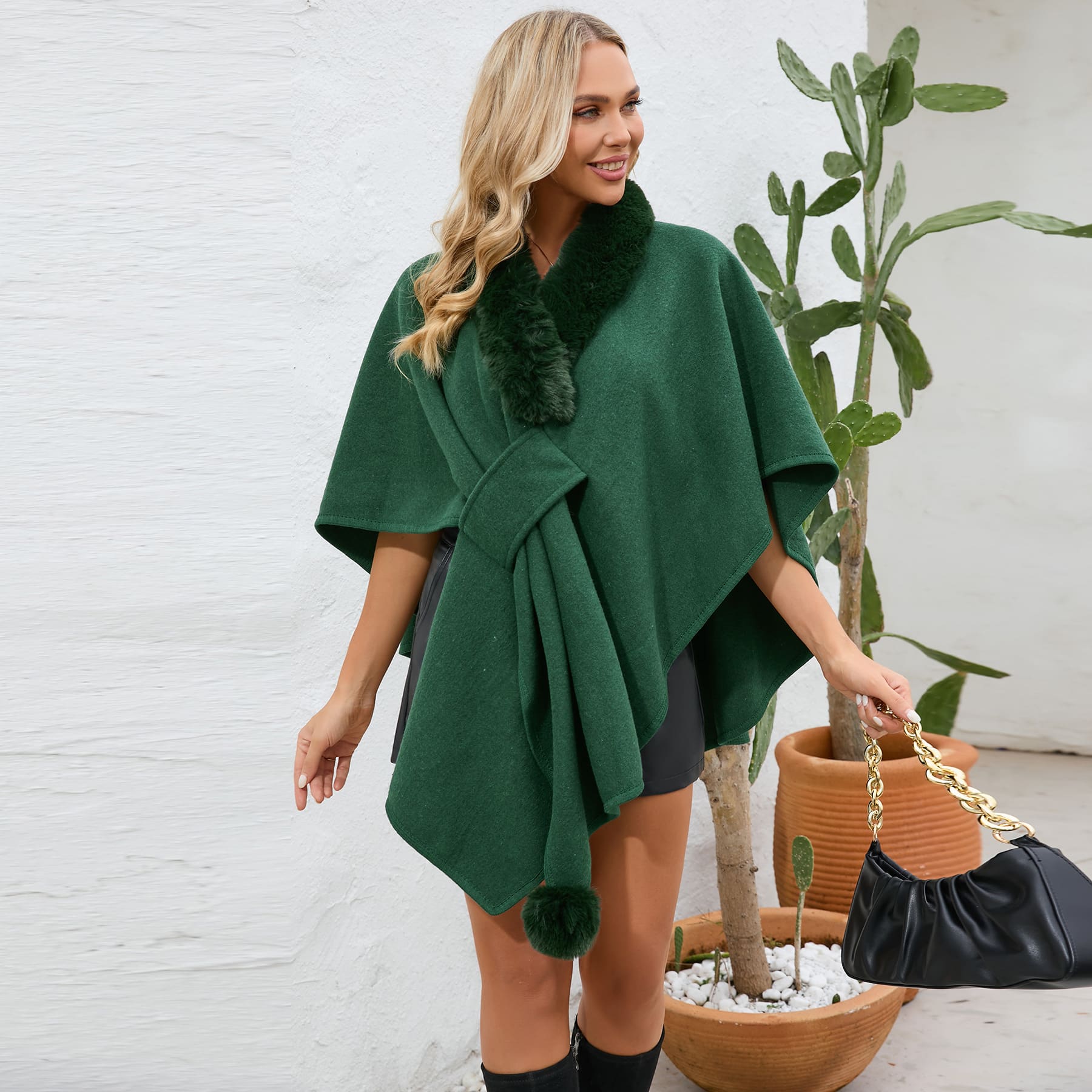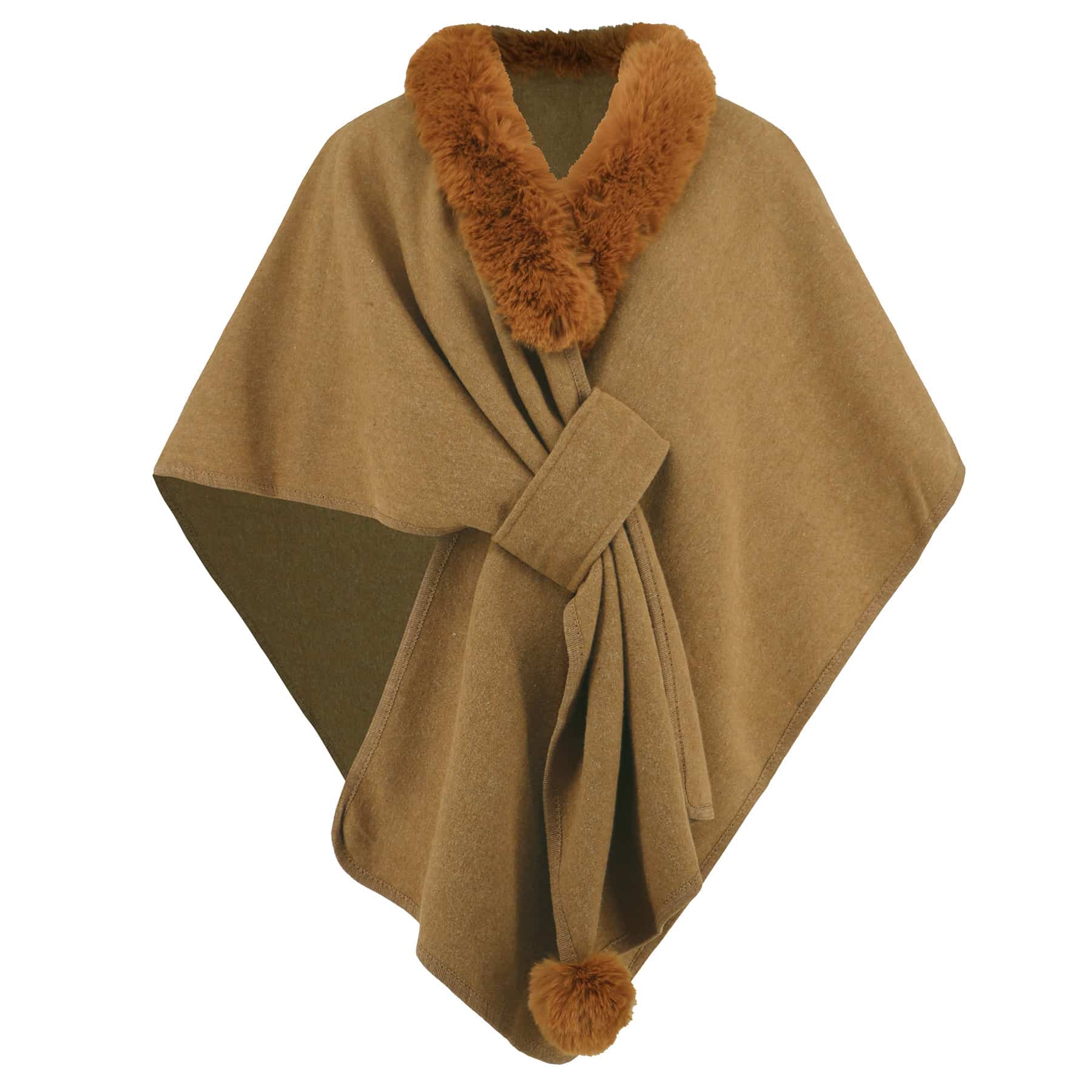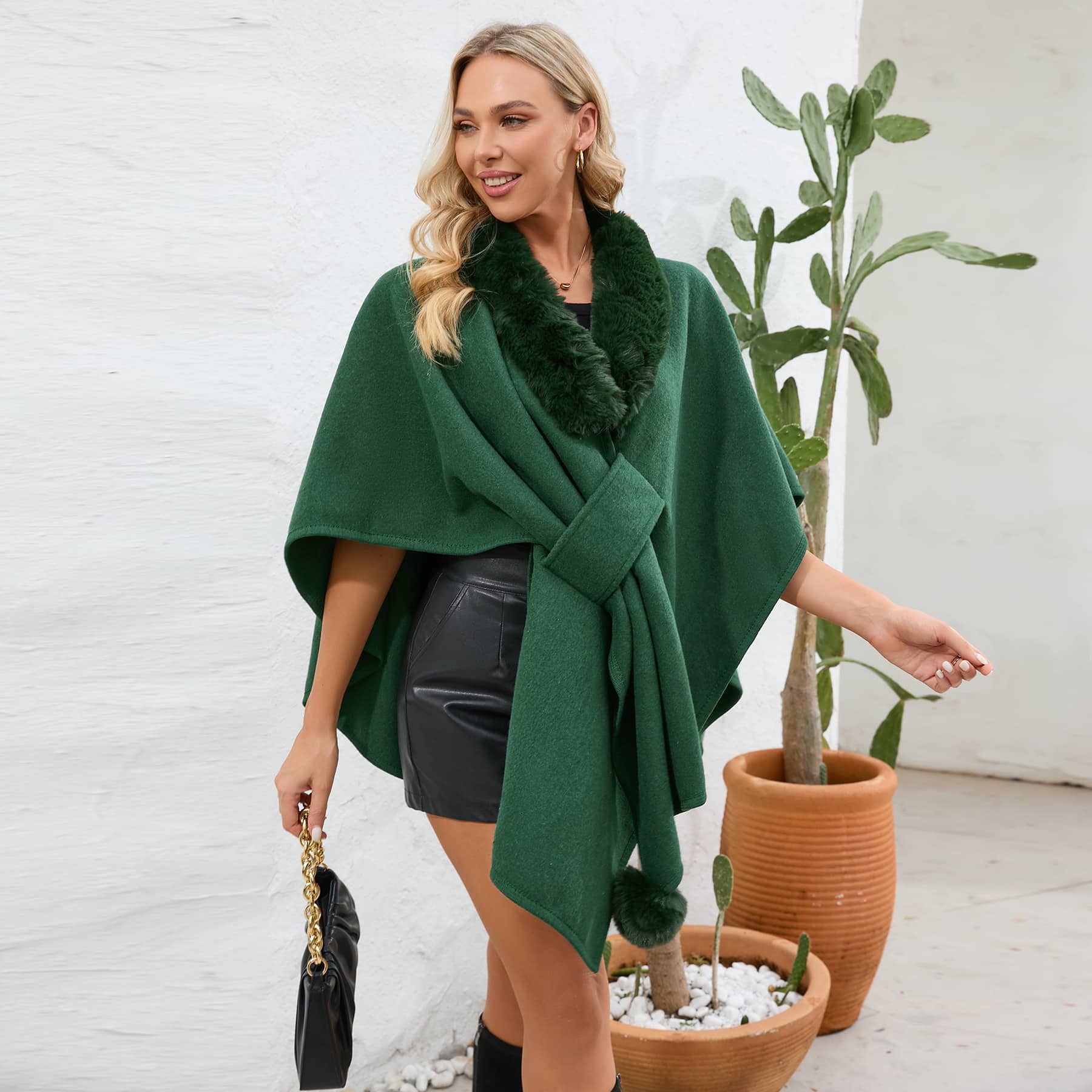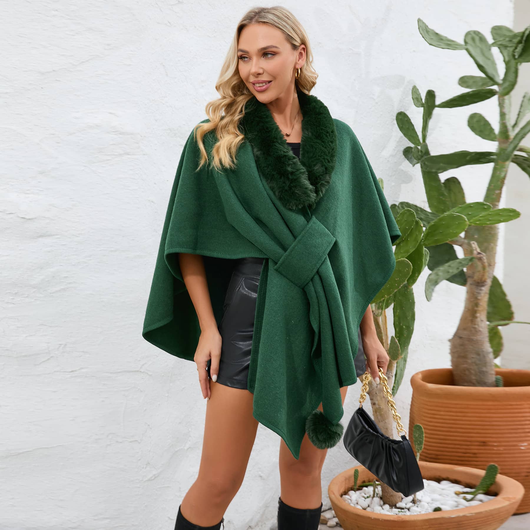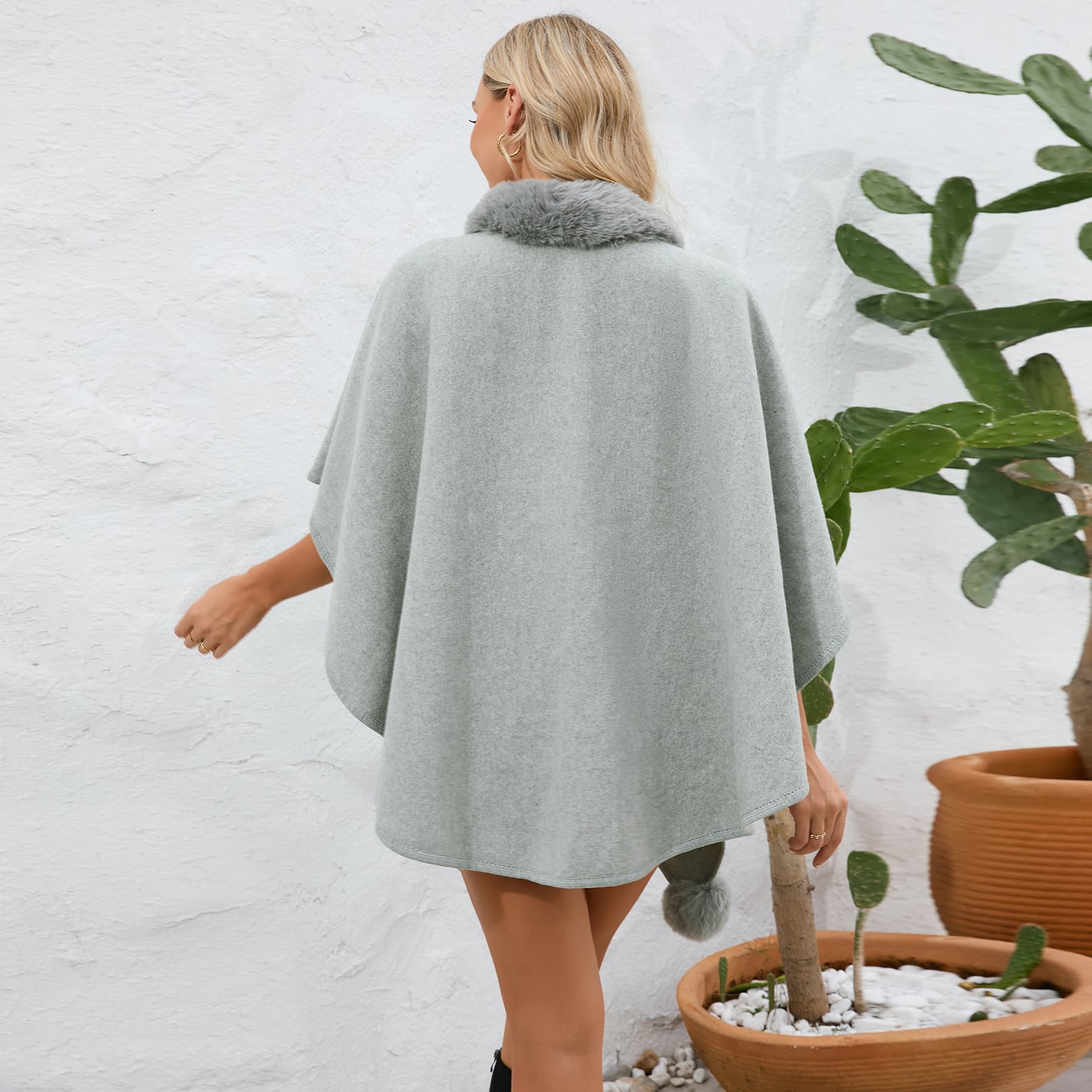 Step into the cooler seasons with style and warmth in our luxurious poncho. Perfect for women who cherish elegance and comfort, this poncho features a lush faux fur collar that adds a touch of sophistication to any fall or winter ensemble. The loose, draped silhouette and long dolman sleeves provide ample freedom of movement and a snug, relaxed fit. Made from soft, wool-like polyester, this poncho is a versatile addition to your wardrobe, keeping you chic and warm during the chillier days. Style: Casual Fit: Loose Fabric: Polyester Pattern: Solid Element: Not Top Length: Regular Sleeve Type: Dolman Sleeve Sleeve Length: Long Sleeve Closure Type: Other Main Composition: Polyester Season: Spring/Autumn