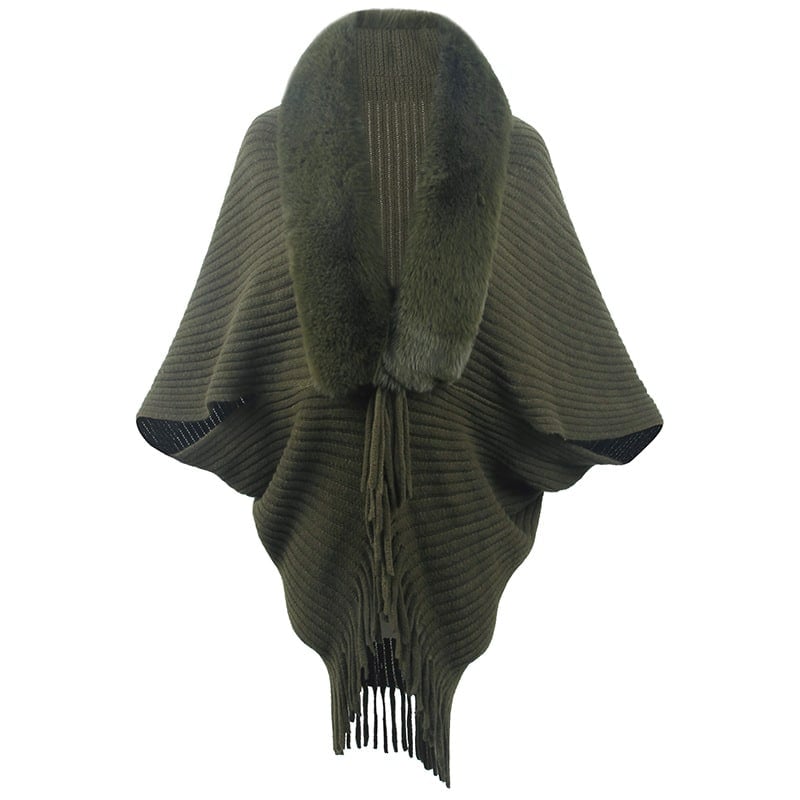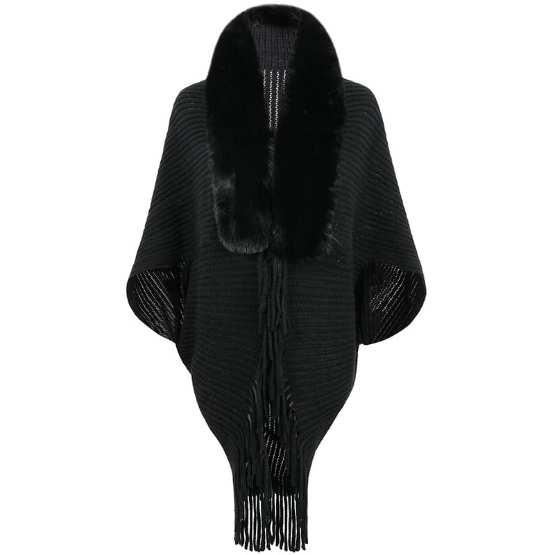 Elevate your style this autumn and winter with our chic knitted cape coat! Expertly crafted with a luxurious faux fur collar and sophisticated tassels, this poncho is not just a garment, it's a statement. The soft jersey fabric ensures comfort, while the solid pattern with fringe element adds a touch of bohemian elegance. Perfect for those looking to stay warm without sacrificing style, this poncho is versatile enough to complement any outfit. Don't let the cold dampen your fashion sense—wrap up in this stylish, long-sleeve poncho and turn heads wherever you go! Style: Casual Fit: Regular Fabric: Jersey Pattern: Solid Element: Fringe Top Length: Long Sleeve Type: Regular Sleeve Length: Long Sleeve Closure Type: Others Main Composition: Polyester Season: Fall/Winter