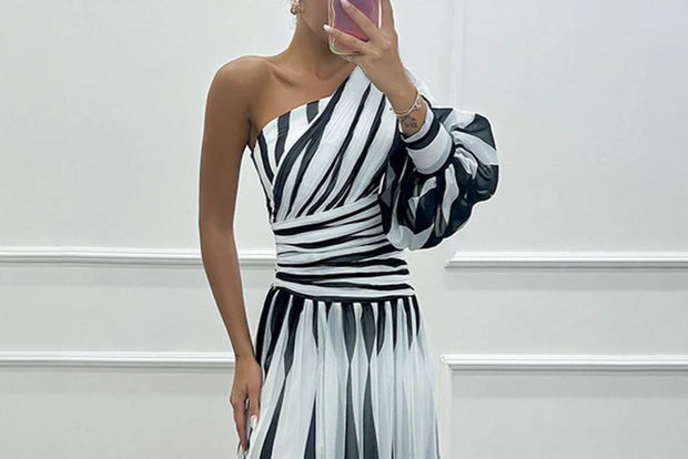 Classy One Shoulder Striped Print Maxi Dress