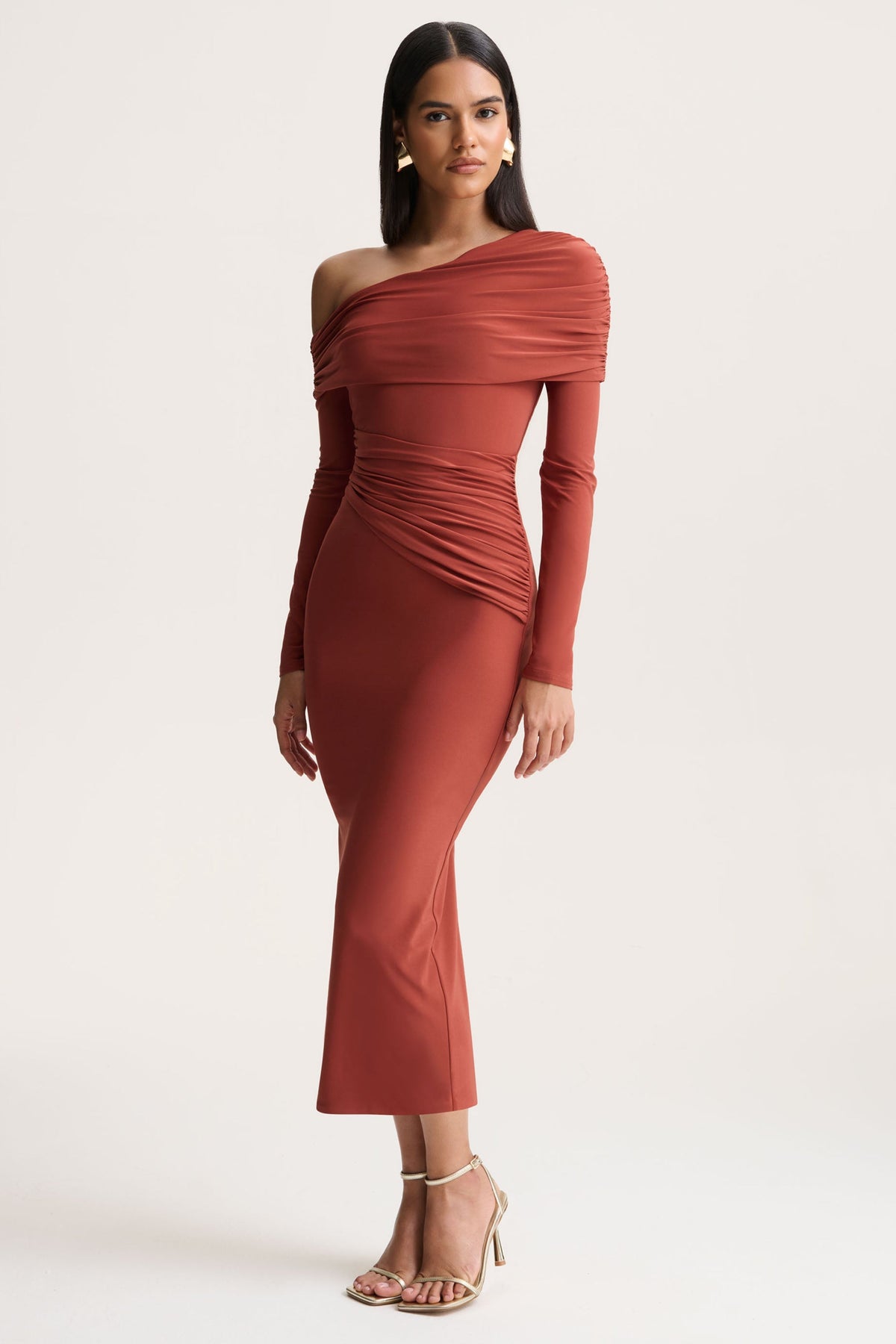 Elliora channels modern sophistication with a sculpted, feminine finish. Crafted from our premium stretch jersey in a warm rust hue, this midi-length design contours the silhouette with effortless ease. The asymmetric neckline creates a striking, contemporary focal point, while the ruched detailing enhances every curve with soft definition. Finished with a centre-back split for graceful movement, Elliora is made for occasions that call for confidence, elegance, and understated glamour.