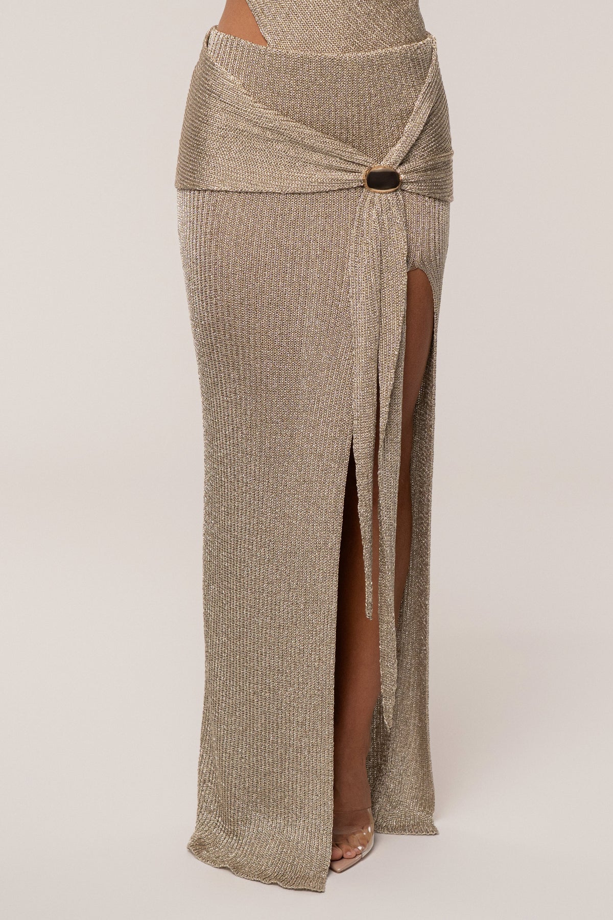 Radiate elegance in our Gold Hazel Metallic Wrap Skirt, designed to blend modern sophistication with shimmering detail. Crafted from metallic sheer-knit fabric, this skirt features a wrap style design with a side slit. A statement knot accented in gold heightens this piece with a touch of elegance. Finished with an elastic waistband for a comfortable, flexible fit. Pair with our Luminous Metallic Bodysuit for the full look. Stretchy. Not sold as set.