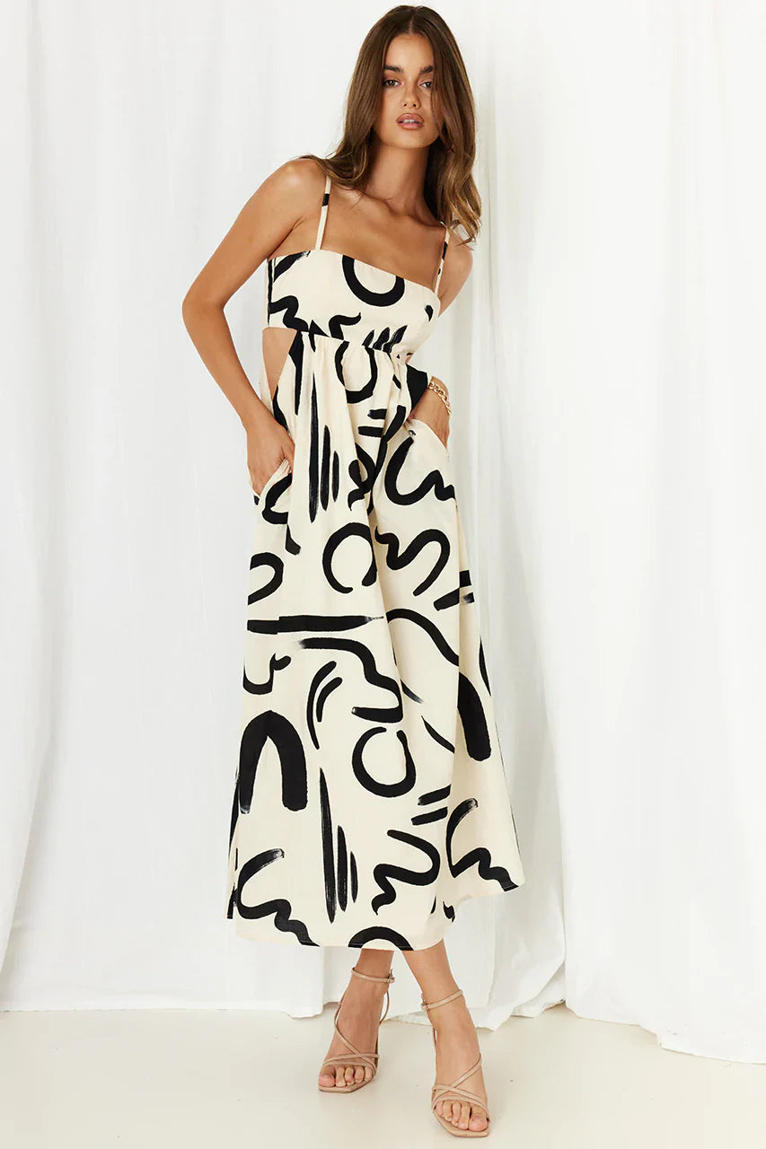 Our York Midi Dress features an adjustable spaghetti straps, cut outs on the side, and an invisible centre back zipper. Lining and no stretch throughout the garment. 100% Cotton.