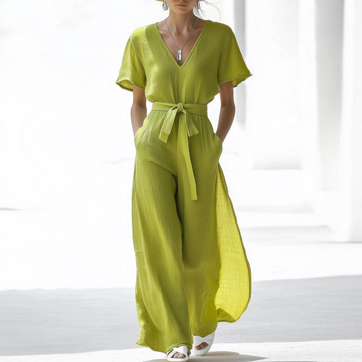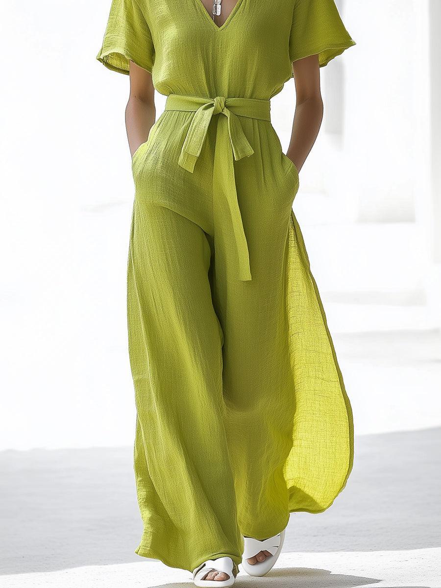 This versatile Green Plain Short Sleeve Jumpsuit is a must-have for any wardrobe. Made with high-quality, breathable fabric, it offers both comfort and style. The short sleeves provide a touch of elegance, making it perfect for any occasion. Elevate your fashion game with this chic jumpsuit.