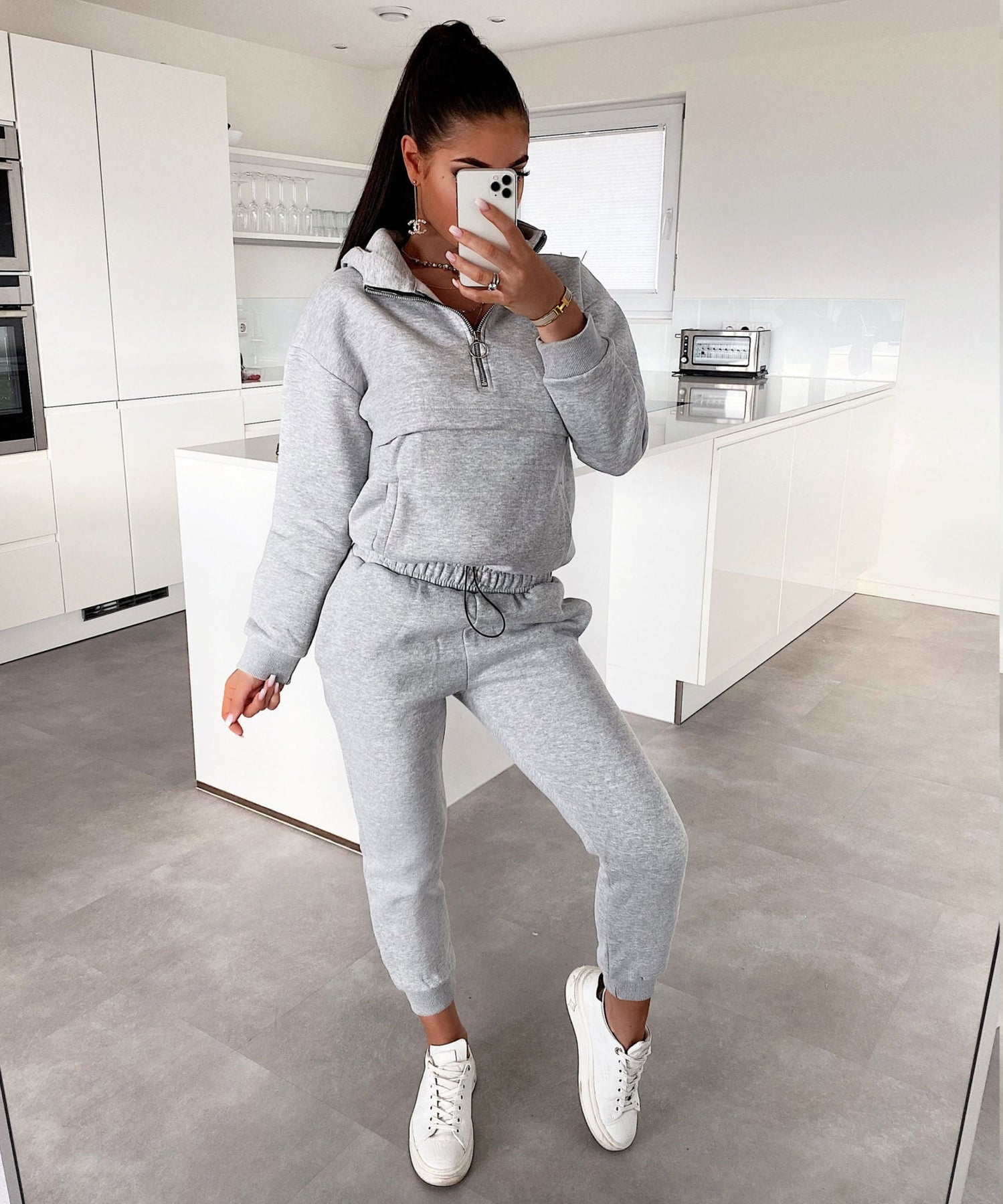 Our soft, lined jogger set is exclusively available from us. Turns out normal. Sweater can be adjusted. Model wears size XS for a tighter fit, her normal size S would also fit great. She is 1.65m tall.