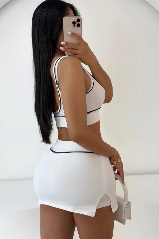 Experience athletic elegance with beautiful outfit, a fresh twist on stylish athleticism. Created for the bold and self-assured, this duo seamlessly fuses fashion and functionality. The short tank top highlights its structured construction with eye-catching contrast piping, providing a flattering and secure fit. Coupled with a high-waisted mini skirt, this ensemble exudes a modern edge while maintaining ultimate comfort. Whether you're off to a relaxed outing or embracing athleisure, is your must-have outfit for effortless flair.