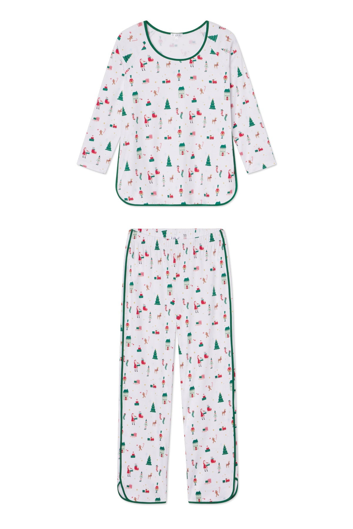 The Pima Long-Long Set in Holly Jolly, a bustling scene of Santa's village in collaboration with Meri Meri, features a three-quarter sleeve scoop neck top and pants with an elastic waistband. Made from 100% Pima cotton.
