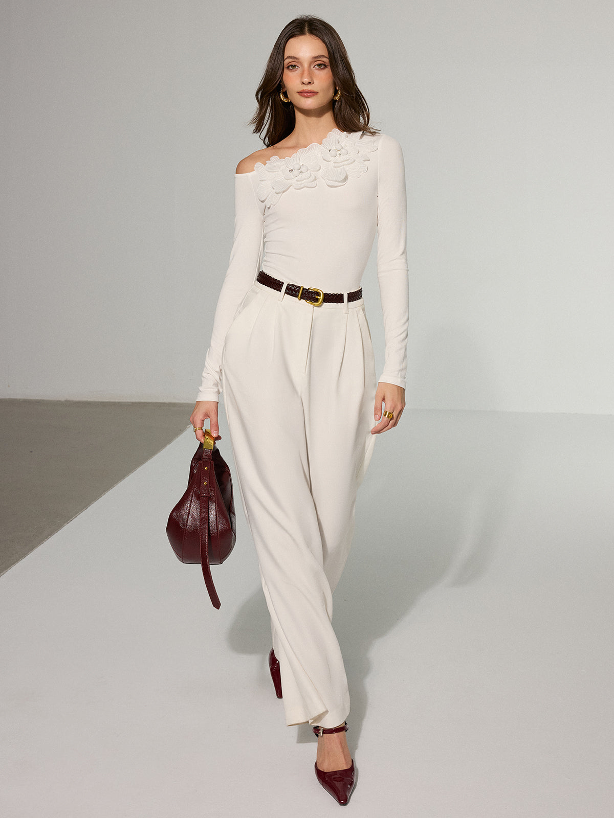 Off-Shoulder 3D Floral Embellished T-Shirt