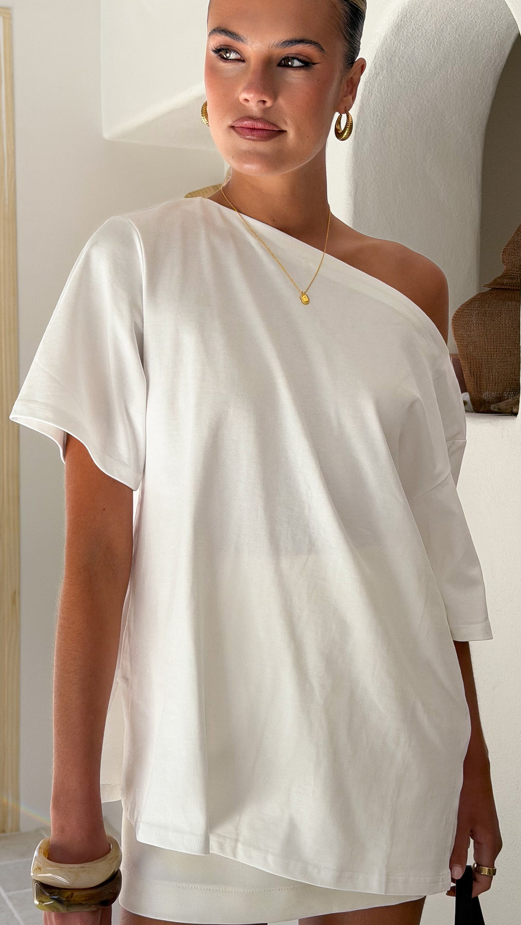 Embrace understated elegance with the Pia One Shoulder Oversize Tee in white. This refined piece showcases an asymmetrical shoulder design paired with short sleeves and an oversized silhouette. Side splits add dimension and movement.